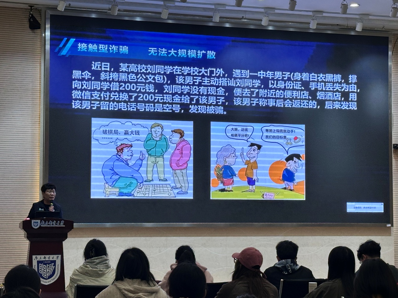 讲座伊始,陈红燕警官结合多年反诈实战经验,从当前高校高发的电信网络诈骗类型入手,深入剖析了诈骗行为的心理机制与社会危害。她指出,随着通讯技术和网络社交平台的快速发展,诈骗手段不断迭代升级,隐蔽性、欺骗性越来越强,大学生作为网络原住民,更应增强辨别能力,筑牢心理防线。