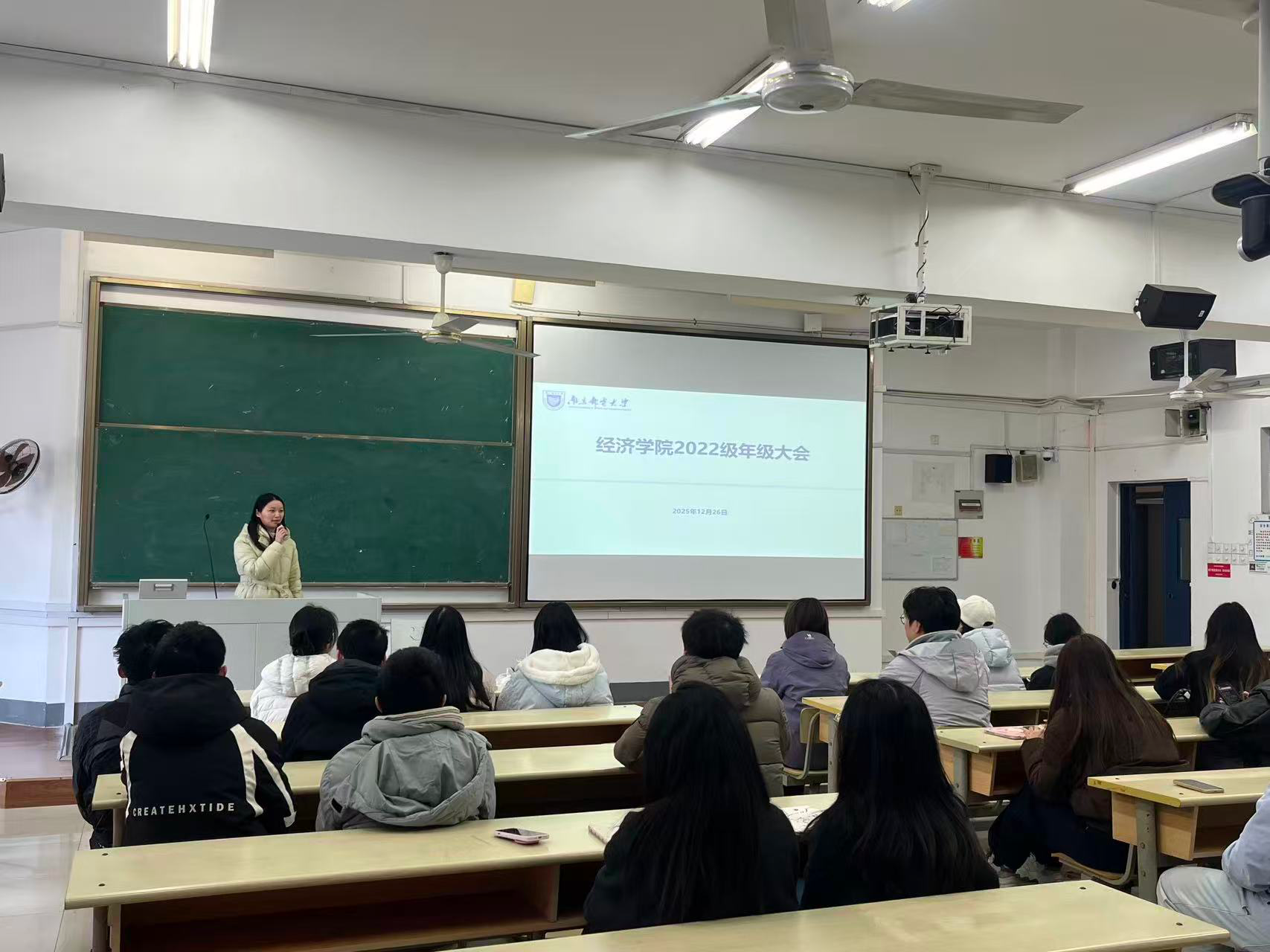为深入落实立德树人根本任务,总结秋季学期学业与就业进展,引导同学们做好毕业前的关键规划与准备,2025年12月26日下午,经济学院召开2022级本科生年级大会。学院党委副书记兼副院长吴迪应邀出席,全体2022级学生参加,大会由2022级辅导员储宜旭主持。