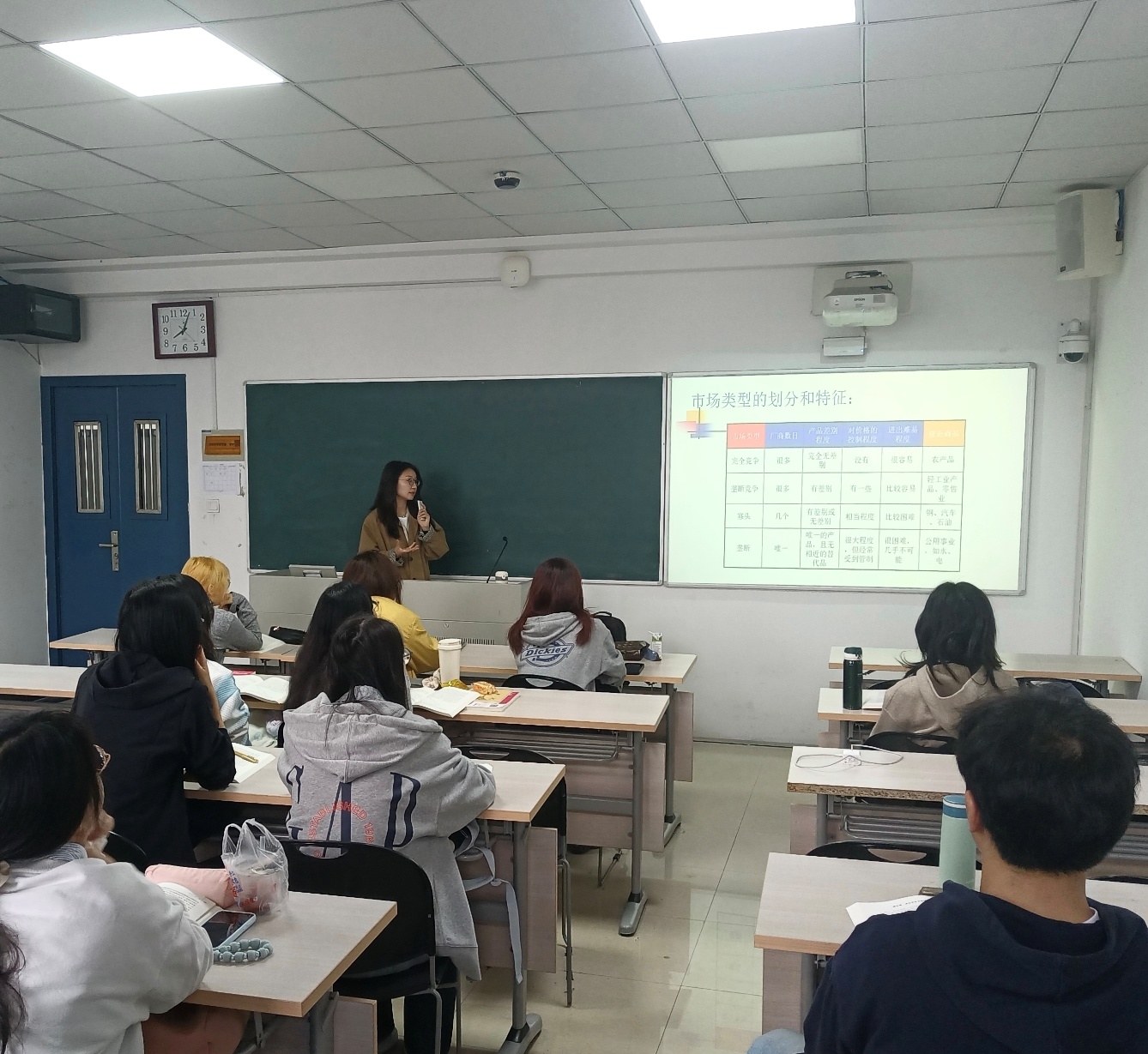 首先,青年教师余雪微围绕不完全竞争市场主题进行了试讲展示。余老师从生产者行为与市场环境的关系切入,系统对比了四种市场类型的特征。在重点讲授垄断市场章节时,她通过铁路运输等生动案例深入剖析了自然垄断与规模经济的内在逻辑,并探讨了垄断厂商的短期与长期决策情形。在授课过程中,余老师充分利用板书与多媒体等方法结合,展现出其扎实的专业基础与积极探索教学创新的良好风貌。