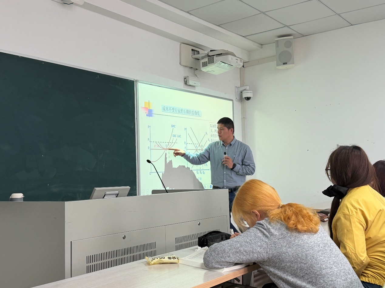 随后,郑晓奇老师对课堂教学进行点评与示范。他充分肯定余雪微老师的授课亮点,认为课程结构完整、逻辑清晰、案例贴切,整体呈现出良好的教学素养与较大提升潜力。同时,他围绕课堂互动设计、案例深度拓展、知识点衔接等方面提出针对性优化建议,助力青年教师进一步打磨课堂。郑老师还结合自身多年教学经验,重点梳理了完全竞争厂商短期与长期均衡的核心考点,将复杂的理论与曲线分析化繁为简,并通过“讲练结合”的方式强化理解与应用,为在场青年教师作出了高质量示范。