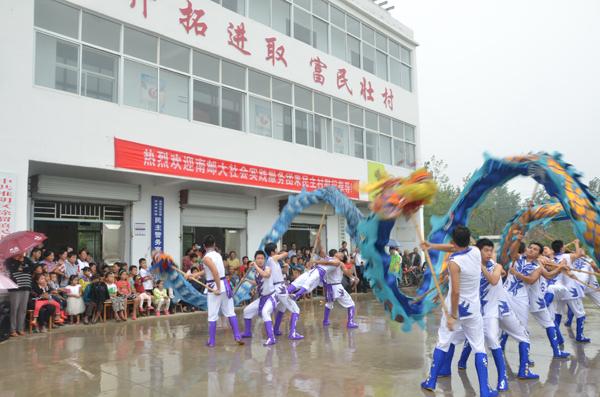 曾经获得全国龙狮精英赛冠军的大学生舞龙队,在民主村党支部、村委会门外广场为村民们送上了一场精彩的舞龙表演。音乐声中两条长龙翩翩起舞,或腾跃,或滚动,或盘起,或穿插,欢快的音乐、专业的表演、宏大的场面,赢得村民们的热烈掌声。“以前这样的专业表演我们只在电视上看过,今天能看到真人的表演真是很开心。”一位村民这样说。
