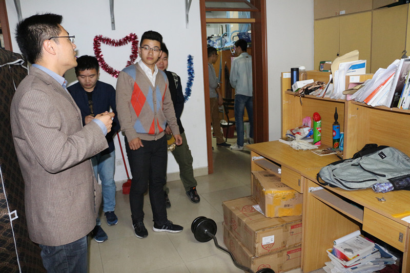 检查结果表明男生宿舍卫生及安全总体状况良好,做到了地面干净、桌面整洁、安全用电。但仍有部分宿舍存在未常开窗通风,宿舍异味严重、宿舍无人但是电源未切断、宿舍个人内务不整、物品乱堆乱放和存在卫生死角等问题。吴波老师对这些宿舍提出了宿舍整改意见,责令其尽快整改,并将在随后进行不定期检查,以确保其宿舍卫生得到良好改善、用电安全得到有效保证。