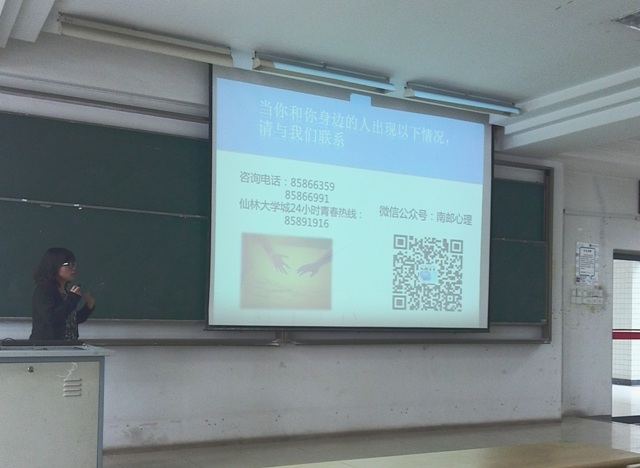 最后,杨娟老师将话题重新转回到大学生身上,并指出:大学生一般都会多多少少的心存在理问题,比如:学习心理问题、人际交往问题、恋爱与性的问题、自我认知问题等,杨老师叮嘱大家,遇到这些问题不要紧张、不要回避,要敢于沟通,只有通过沟通才有解决问题的可能,才会拥有一个健康的心理。