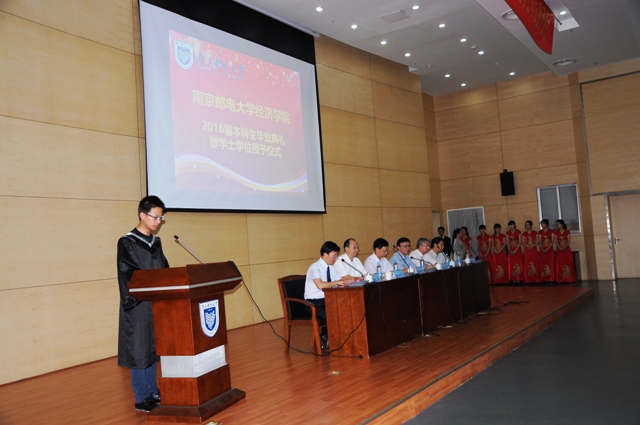 教师代表经济统计系主任黄犚老师在发言中提醒毕业生,扩展知识、提升文化、成熟思想、陶冶情操,是今后应全面关注并孜孜追求的,并期待同学们早传佳音。学生代表陆晓蕾同学在发言中回忆了大学期间点点滴滴,深情回顾了属于南邮学子的独家记忆,鼓励大家带着坚毅,面向未来,实现“明日母校以我为荣”的远大目标。