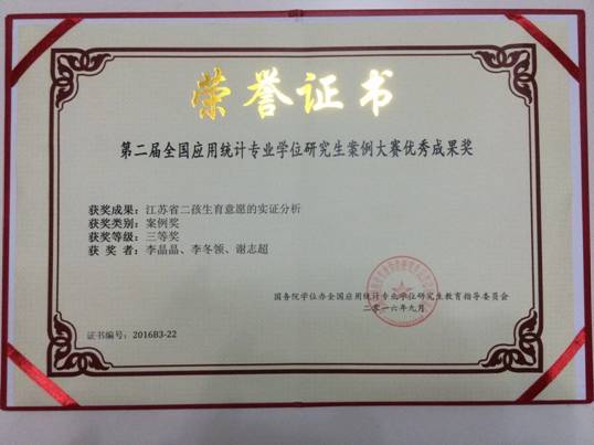 2016全国应用统计专业学位研究生案例大赛成绩近日揭晓,我院黄宝凤教授担任指导教师,李晶晶、李冬领等三位同学参赛的《江苏省二孩生育意愿的实证分析》案例获得三等奖。