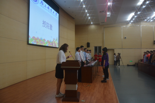 开学典礼的最后一项内容是“授院徽”,由主席台上的领导和教师为6位新生代表佩戴院徽,新生代表行礼感谢老师的启智之恩,言传身教之恩,指引人生之恩。