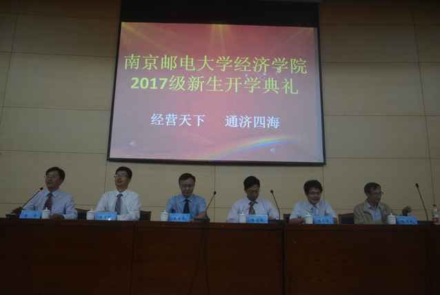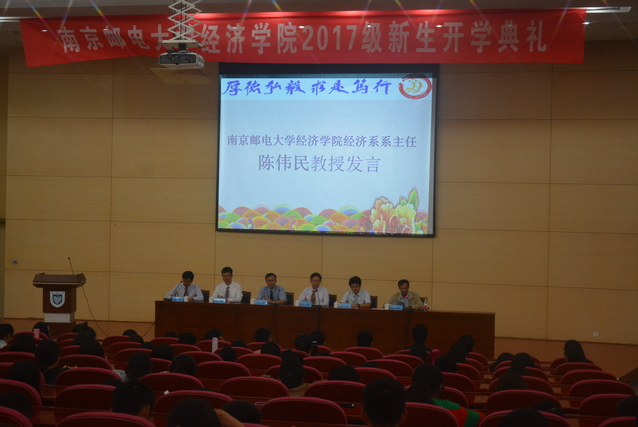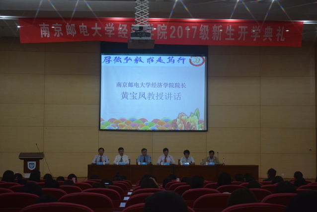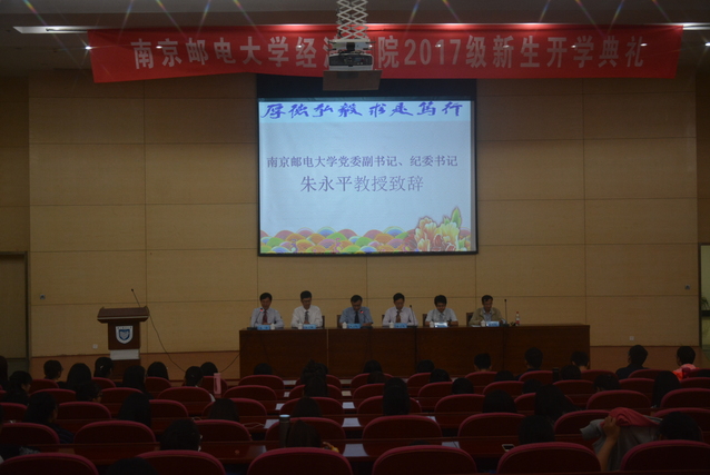 2017年9月24日14:00,经济学院在仙林校区图书馆报告厅举行了2017级新生开学典礼。南京邮电大学党委副书记、纪委书记朱永平教授,经济学院院长黄宝凤教授,经济学院副院长王子敏副教授,经济学院院长助理蔡冬青副教授,经济学院经济系系主任陈伟民教授,以及各年级辅导员出席了本次开学典礼。各班辅导员助理,2017级221名本科新生和19名硕士研究生新生参加了本次开学典礼。开学典礼由经济学院党委副书记董军副教授主持。
