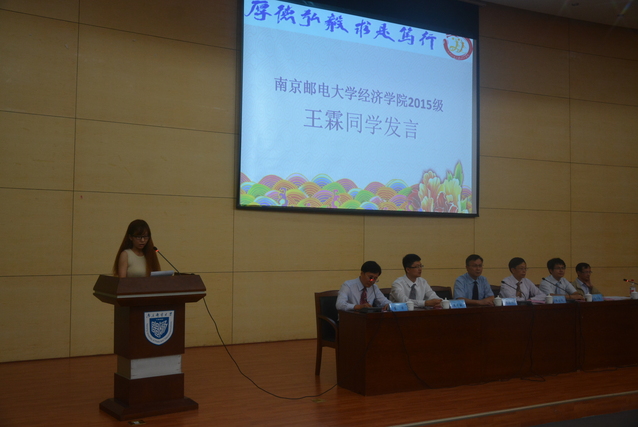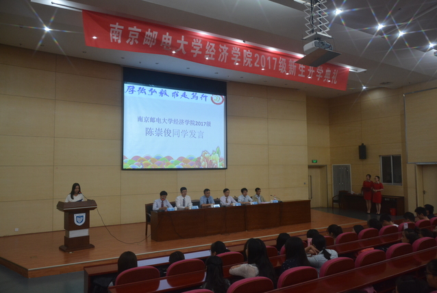 2017级经济学专业的陈崇俊同学作为新生代表发言,在未来的四年中要学会做人,学会做事,学会学习,争取成为一名优秀的南邮学子。