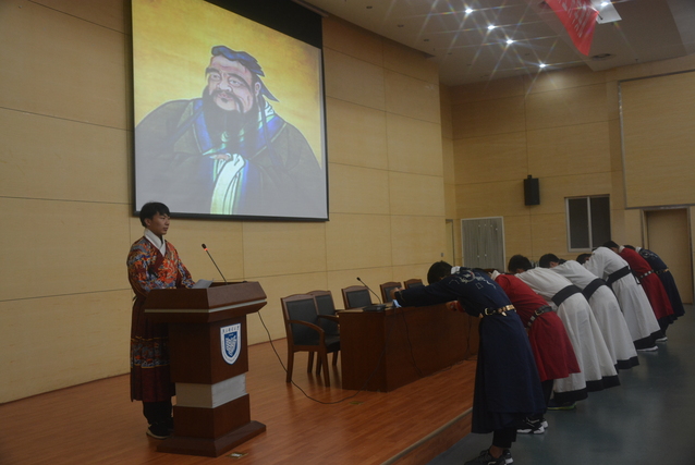第二部分,祭孔。全体学生首先观看了一段关于孔子生平的视频简介。此项仪式由2016级唐泽坤同学担任主祭并诵读《祭孔子文》。随后,主祭带领7名2017级新生代表和全体同学向孔子的画像进行祭拜,一拜万世先师,二拜薪火相传,三拜继往开来。