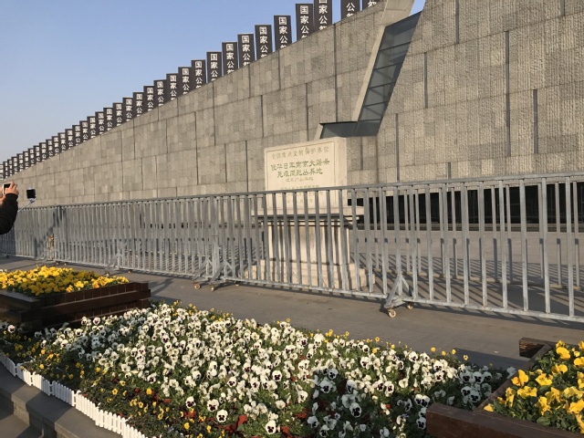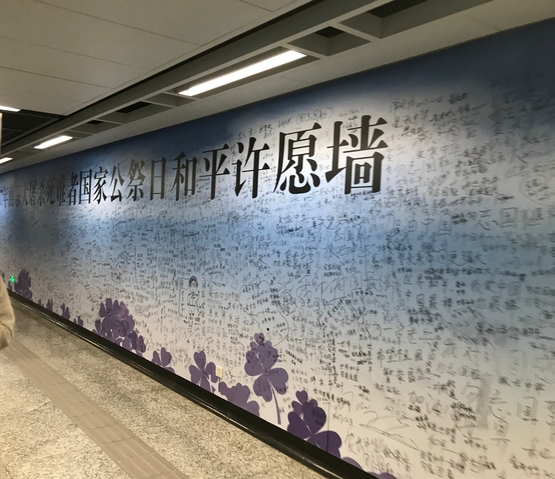在12月10日早上大家穿着朴素,怀着一颗虔诚的心,从学校出发,前往南京大屠杀遇难同胞纪念馆。虽然天气晴朗,但这份沉重的心情却不能有丝毫改变。遗憾的是,由于公祭仪式即将举行,纪念馆进行临时闭馆,但是在纪念馆门口巨大的雕塑深深地刺痛着所有同学的内心,石碑上显眼的文字更是让所有人知道这段历史背后的残忍。在地铁出口处,有一面2017年南京大屠杀死难者国家公祭日和平许愿墙,上面满满的书写了大家对和平的期许,以及对历史的铭记。“勿忘国耻,振兴中华”正是这面墙上出现频率最高的字眼,作为当代大学生,这也正是应该肩背的巨大责任。