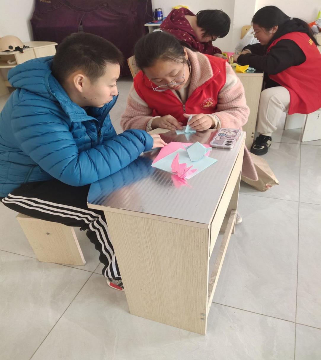志愿者们与残障儿童一起折纸