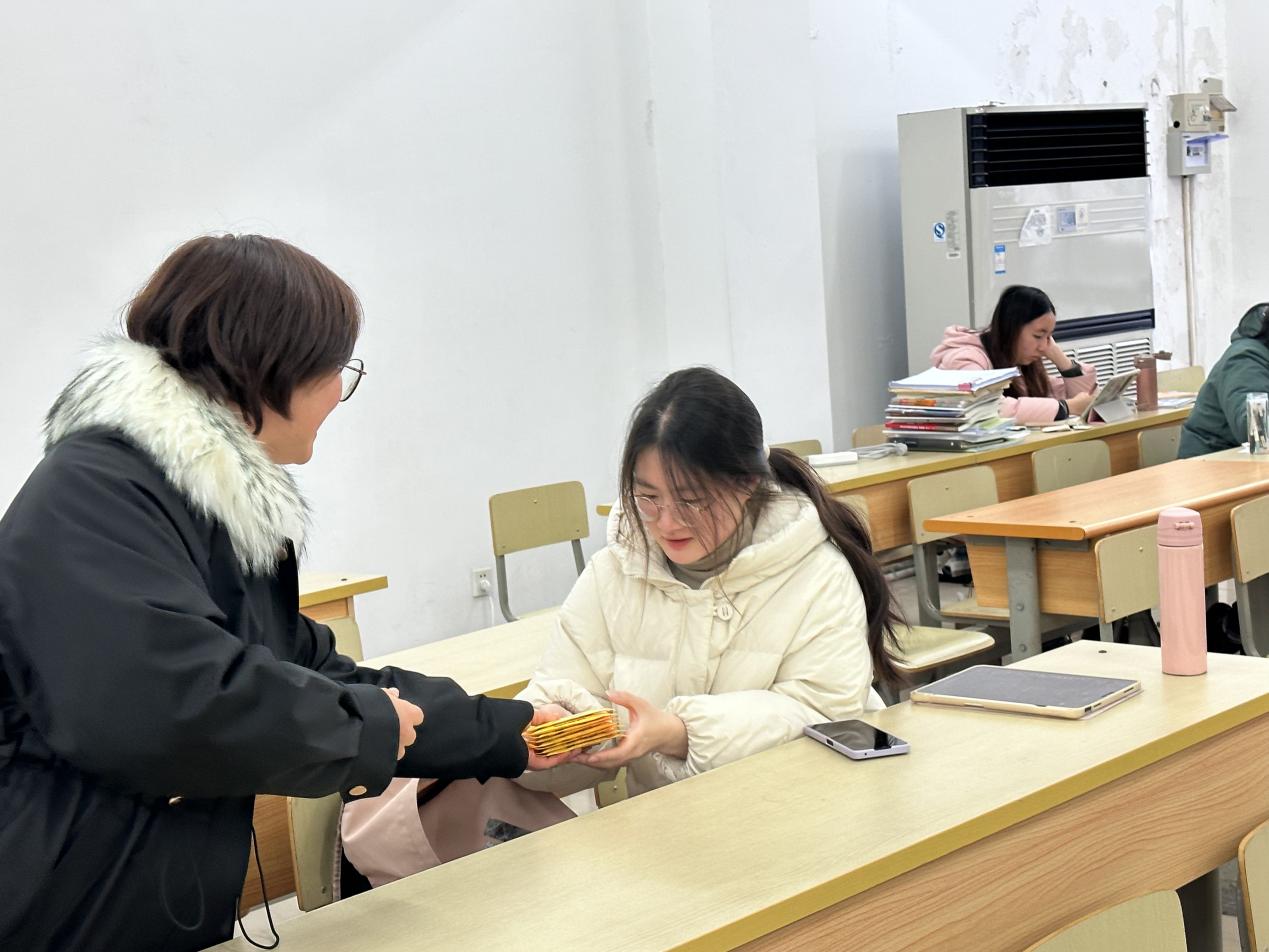 学院领导老师与考研学子亲切交流,希望同学们保持平和心态,嘱咐大家提前熟悉考场,注意作息和饮食,安心备考,从容自信地迎接考试,祝福考研学子都能考上心仪的学校。同时学院为考研学子精心准备了暖宝宝,希望这份温暖能驱走冬日的寒冷,驰骋考场,一战成硕!