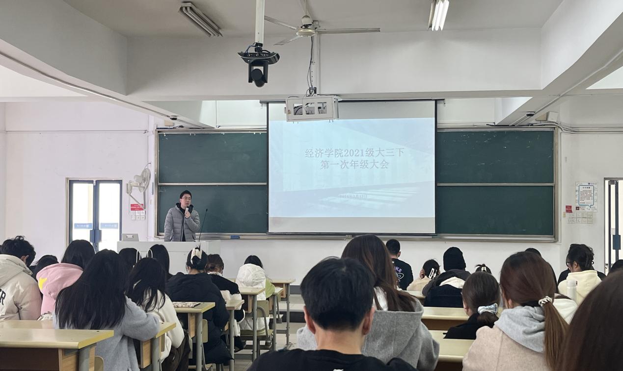 为帮助同学们尽快找到奋斗目标,总结近期重要事项,经济学院2021级于2024年3月13日在教4-101召开了大三下第一次年级大会。大会由辅导员王珏主持,2021级全体学生参会。