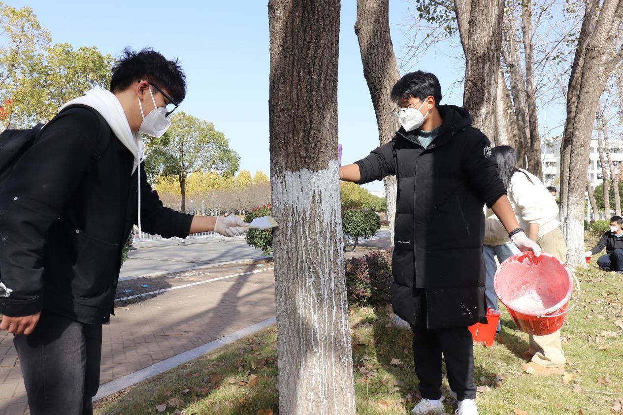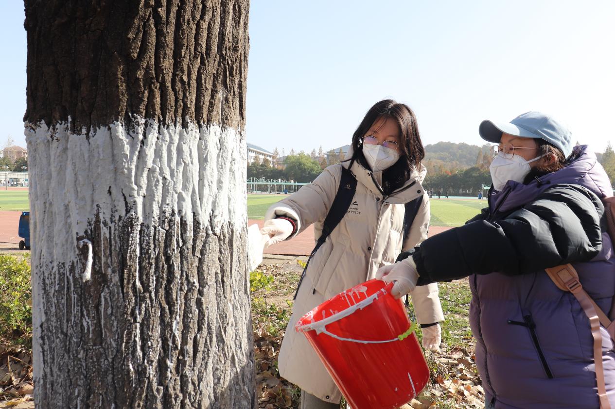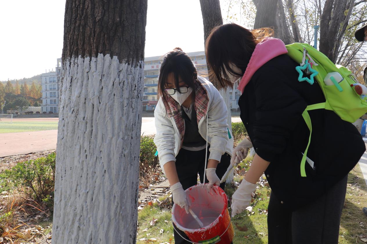 活动初始,后勤管理处工作人员为同学们讲解了树干涂白的原理,学生们认识到,为树木刷上特制涂料,不仅有防虫杀菌的作用,并且具有反射阳光、防止树皮冻裂等多重保护作用,能够帮助树木安全越冬。听完讲解后,同学们领取了刷子、小桶、手套以及口罩,在后勤管理处工作人员的示范下开始进行树干涂白劳动,冬日暖阳下,操场旁的树林里是同学与老师们劳动的身影,为树木换上了崭新的“御寒外衣”。