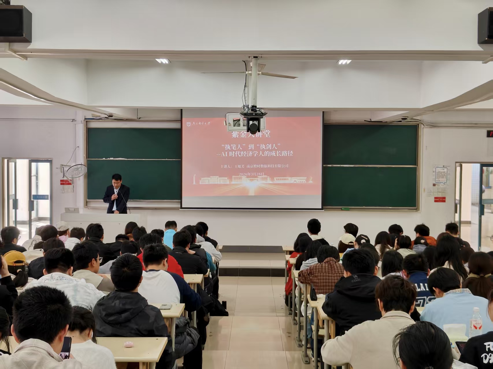 3月28日下午,由本科生院主办,经济学院承办的南京邮电大学“紫金大讲堂”——企业家讲座第169次活动在仙林校区教4-101举行。我校经济学专业2001级校友、南京橙时数据科技有限公司创始人王旭芳作题为“从‘执笔人’到‘执剑人’——AI时代经济学人的成长路径”的专题讲座。讲座由经济学院副院长杜运伟主持。