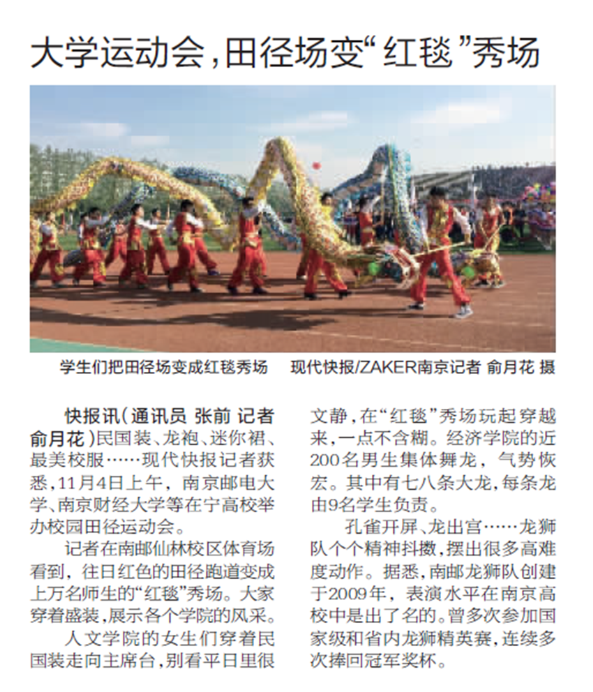 11月4日上午,南京邮电大学在仙林校区体育场举办第47届运动会。开幕式上,我院同学精神抖擞、斗志昂扬,迈着整齐的步伐走过主席台,富有特色的龙狮队伍在朝阳下熠熠生辉,成为开幕式里一道靓丽的风景线。在表演环节,大学生龙狮团带来了舞龙舞狮表演《盛世华章太极舞龙》,升龙腾云,翻身振翼;九龙齐舞,变幻莫测。他们精彩演绎了平盘波浪、飞龙在天等一系列高难度动作,赢得了现场师生的阵阵掌声。现代快报进行了相关报道。