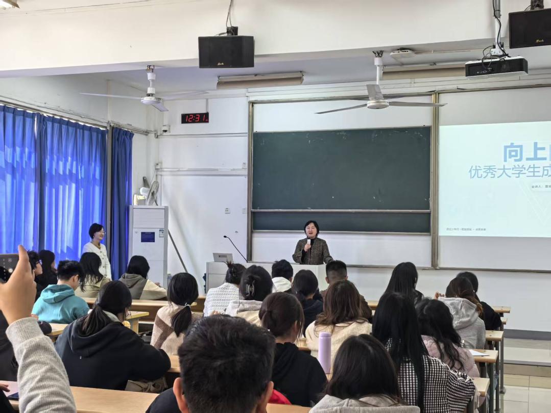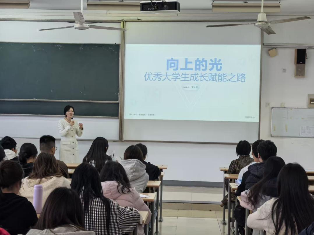2025年10月22日下午,南京邮电大学第二百一十八期菁英人才学校暨经济学院学生骨干培训班第六次课程于仙林校区教3-204顺利举行。本次课程由夏宏玉老师主讲,主题为《向上的光,优秀大学生成长赋能之路》。学院党委副书记、副院长吴迪老师以及菁英班全体学员和学院学生骨干共同参与学习。